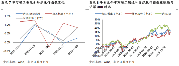 2025年11月24日至11月28日,上证综指上涨1.40%,深证成指上涨3.56%,创业板指上涨4.54%。分行业来看,申万轻工制造上涨4.17%,相较沪深300指数+2.53pct,在31个申万一级行业指数中排名5;申万纺织服饰上涨2.75%,相较沪深300指数+1.11pct,在31个申万一级行业指数中排名16。